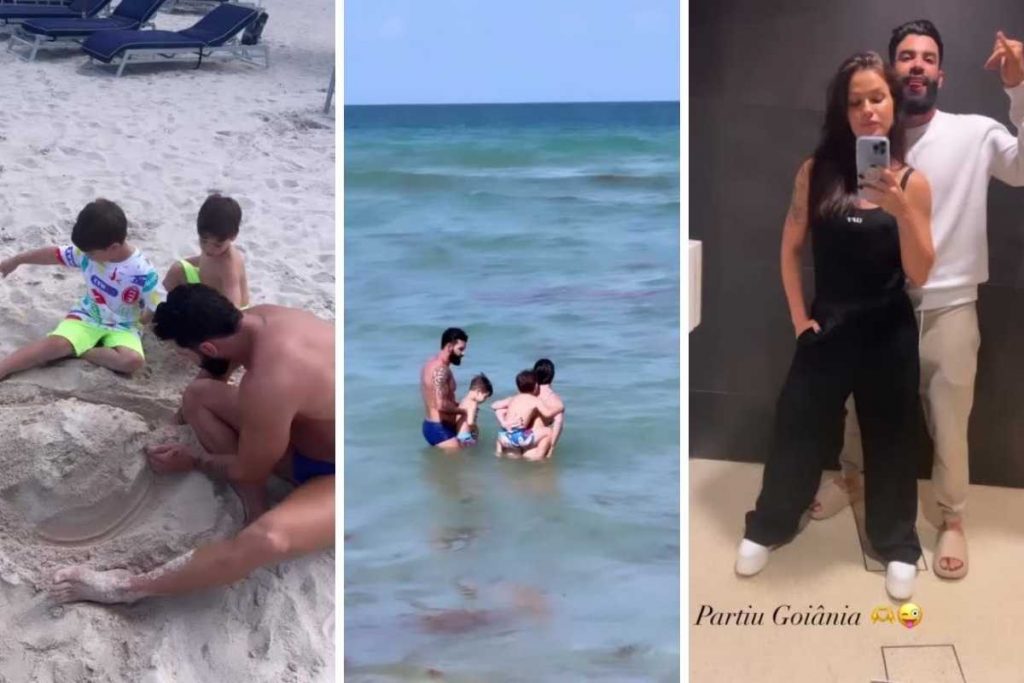 Em vídeos publicados nas redes sociais do casal, o cantor sertanejo foi clicado fazendo construções de areia com os pequenos. Em seguida, os quatro foram se refrescar em um banho de mar, e posteriormente, curtiram uma piscina antes de voltarem ao Brasil.