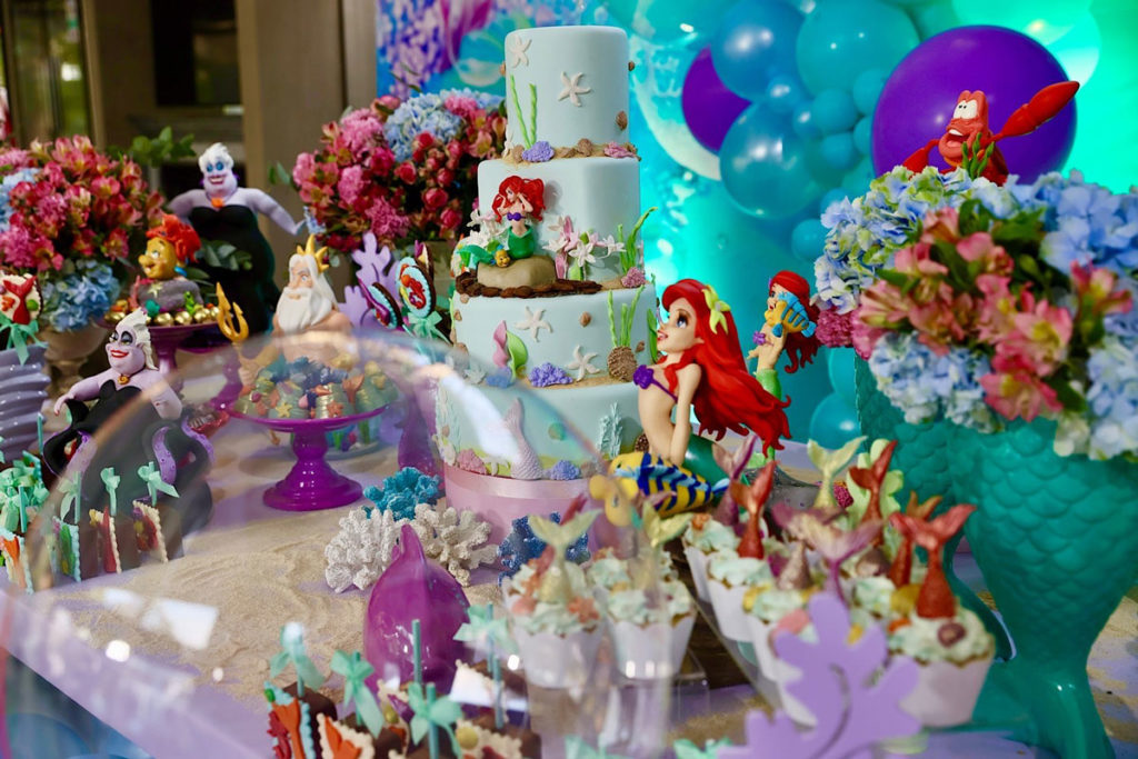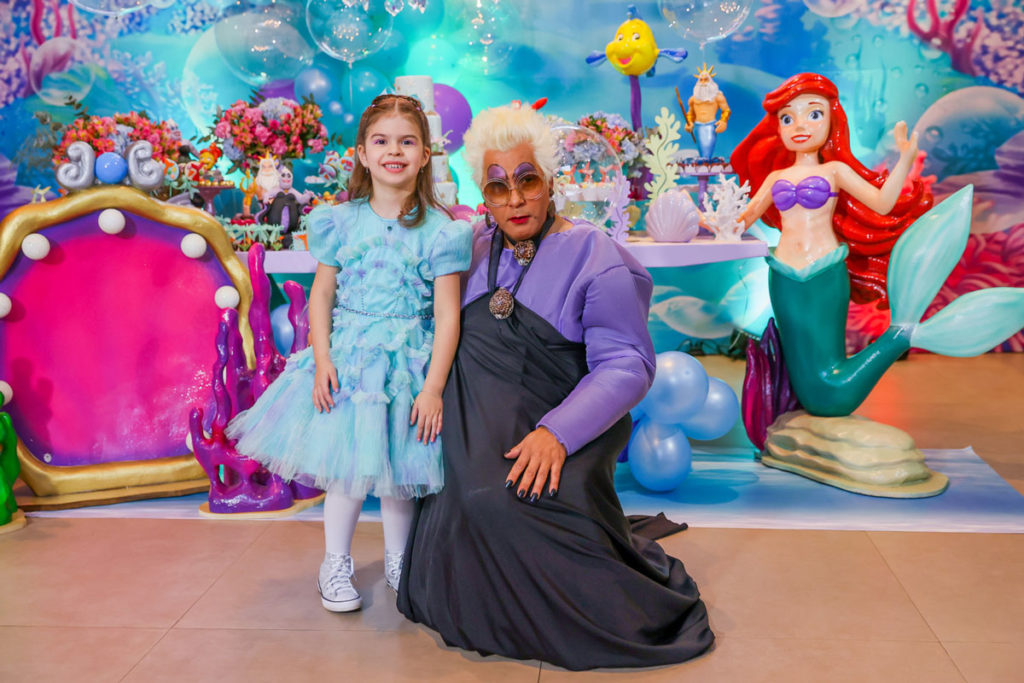 Além do enorme bolo, a mesa contou com docinhos personalizados e itens que relembravam o universo de Ariel, bem como uma estátua da sereia para alegrar Valentina e seus convidados. Ah! E a vilã Úrsula também apareceu, mas ela estava mais amigável e aceitou tirar fotos com a pequena aniversariante.