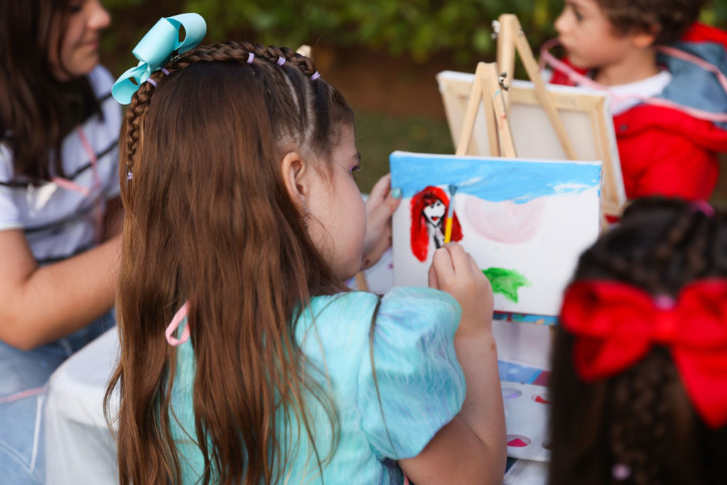 Para a diversão da criançada, rolou uma roda de pintura. Vários quadrinhos com telas vazias foram preenchidas com os desenhos dos convidados e de Valentina também, claro, que deixou marcado o seu amor pela personagem da Disney.