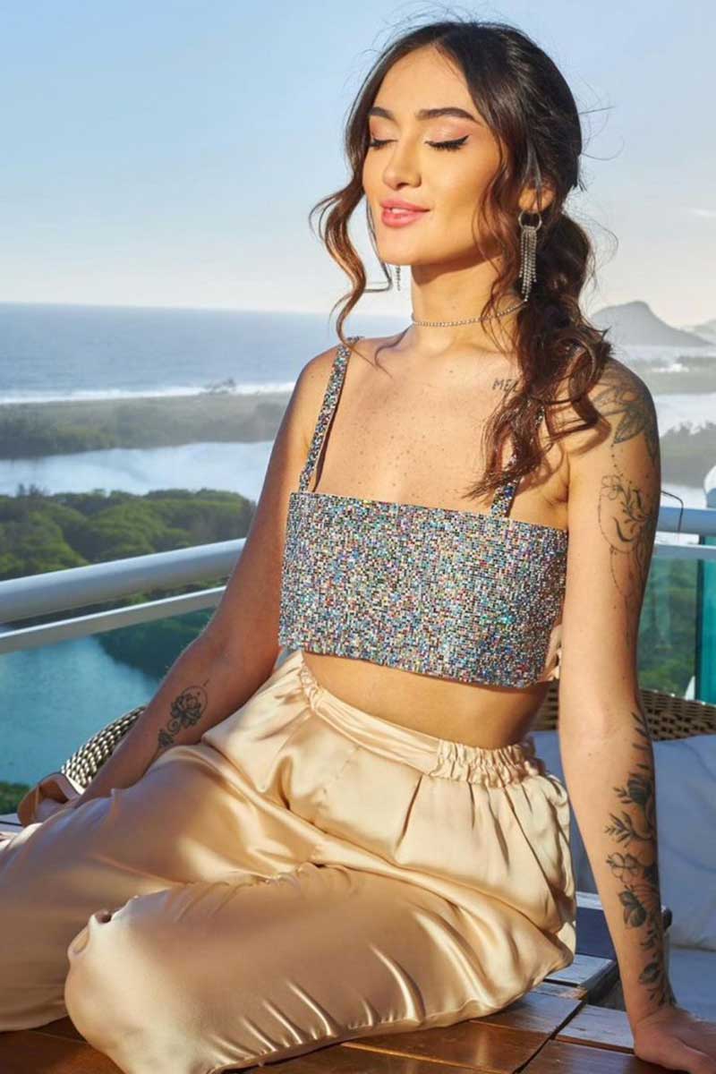Dia desses, logo depois que foi eliminada do BBB22, Brunna Gonlçalves participou de um show da esposa, a cantora Ludmilla, com um look pra lá de lindo. Um cropped todo trabalhado em cristais, com um short também cheio de brilho.