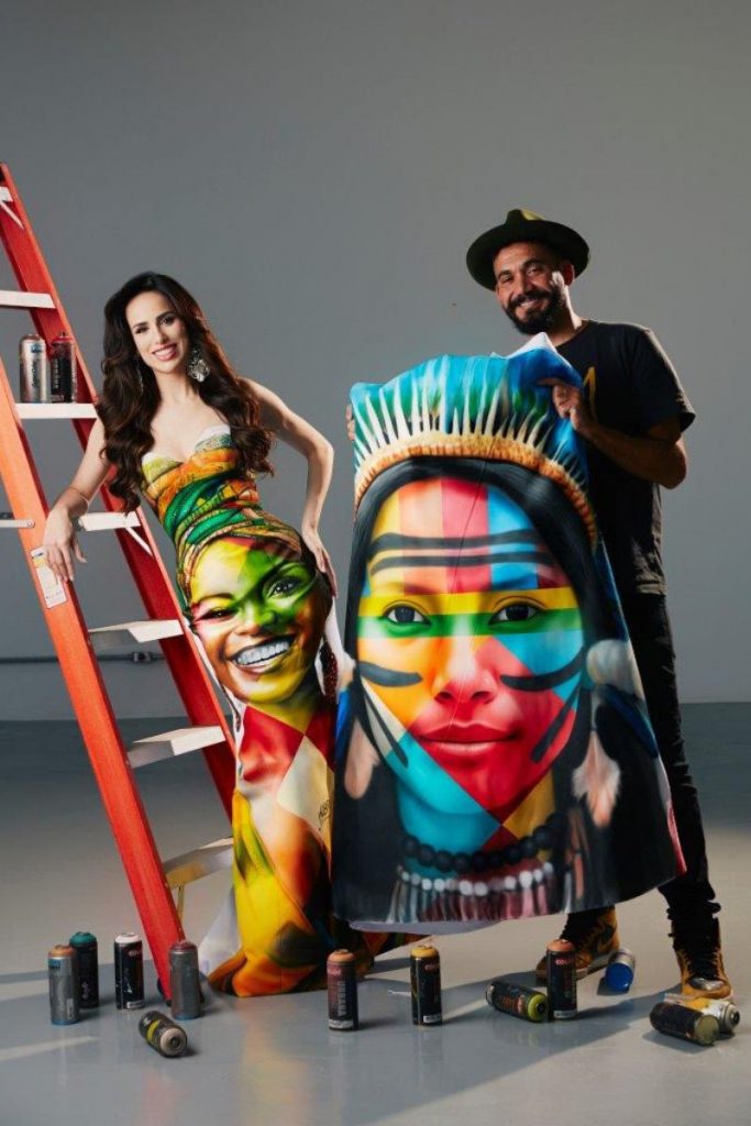 Em uma “tela branca” em formato de vestido, criado pelo estilista Bruno Oliveira, o muralista retratou a diversidade étnica com uma mulher preta e outra representante dos povos originários.
