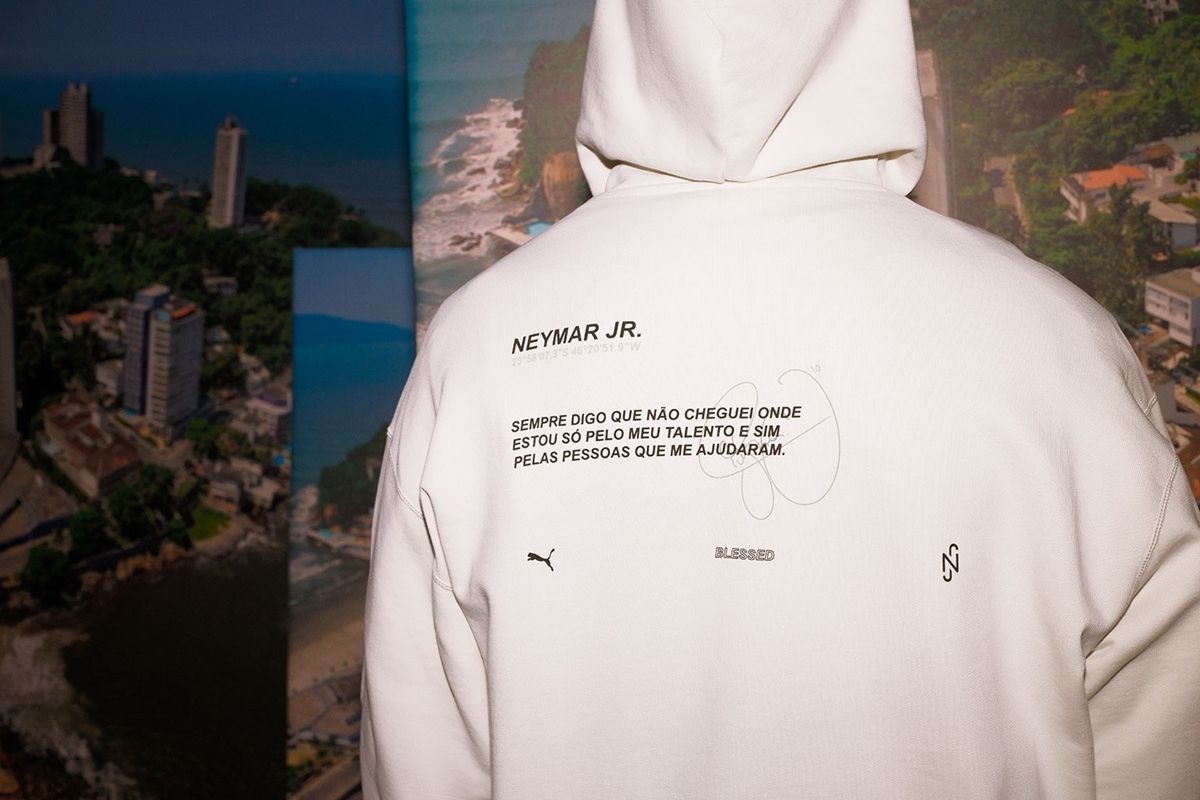 Com Neymar como co-criador da coleção, as peças trazem gráficos significativos inspirados em sua vida no Brasil. Coordenadas de São Vicente, bem como a palavra “bendito” – que ele tem tatuado nas costas. As peças também trazem uma das frases favoritas de Neymar, que ele define com o mantra de sua vida: “Nem sempre se trata de ser o melhor ou o maior, mas sim inspirar as gerações futuras”.