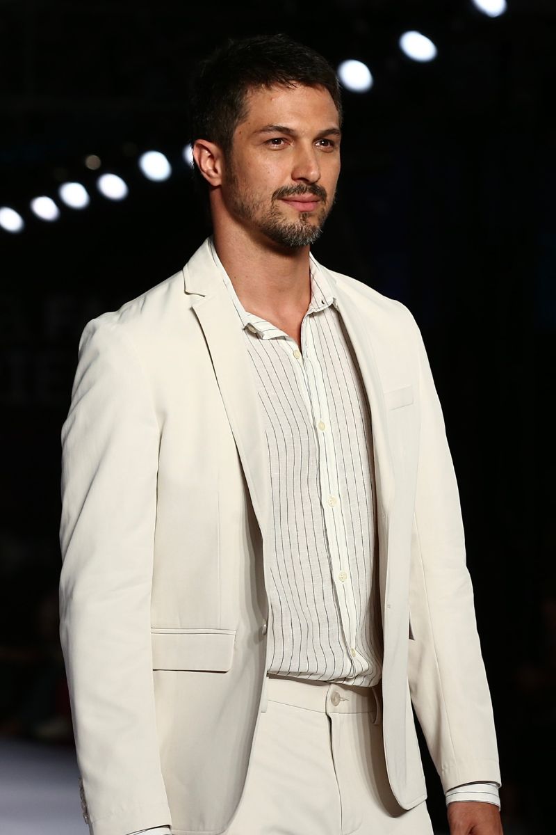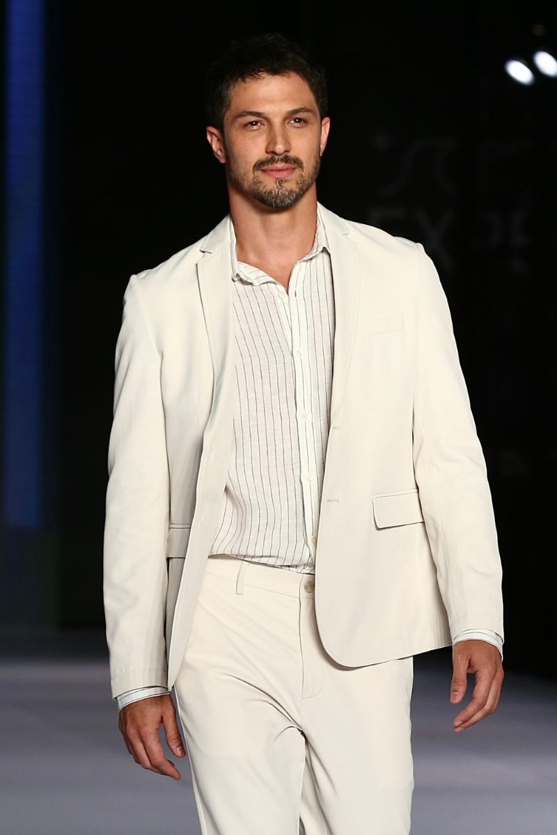 Vestido com a marca FOXXTON, Rômulo deixou seu personagem da trama das 21 horas da Globo descansando nos estúdios da emissora, e arrasou na passarela.