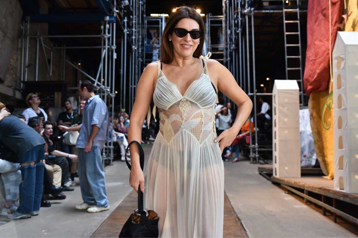 Grávida de sua primeira filha com Victor Sampaio, a atriz e apresentadora arrasou no modelito para conferir aos desfiles da 56ª edição da SPFW, estando com um vestido verdinho transparente, com aberturas na região da barriga e sem mangas, sendo um look bastante confortável. Óculos escuros completaram o visual.