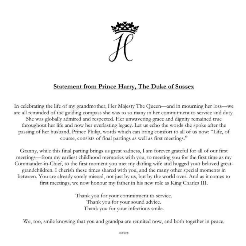 “Ao celebrar a vida de minha avó, Sua Majestade, a rainha — e ao lamentar sua perda —, todos nos lembramos da bússola orientadora que ela foi para tantos em seu compromisso com o serviço e o dever. A vida, é claro, consiste em despedidas finais, bem como primeiros encontros.