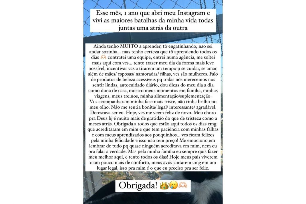 “Vocês acompanharam minha fase mais triste, não tinha brilho no meu olho. Não me sentia bonita, legal, interessante ou agradável. Detestava ser eu. Hoje, vocês me veem feliz de novo. Meu choro pra Deus hoje é muito mais de gratidão do que de tristeza, como meses atrás”, disse.