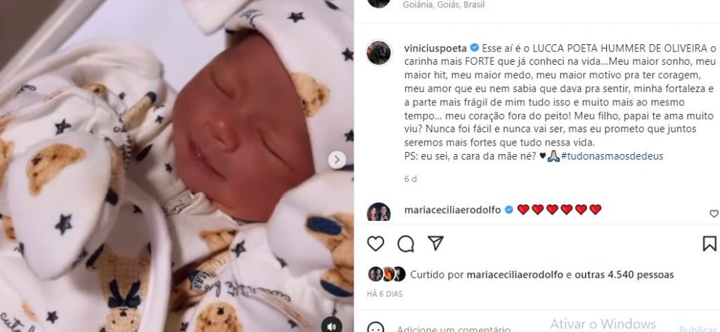“Esse aí é o LUCCA POETA HUMMER DE OLIVEIRA o carinha mais FORTE que já conheci na vida…Meu maior sonho, meu maior hit, meu maior medo, meu maior motivo pra ter coragem, meu amor que eu nem sabia que dava pra sentir, minha fortaleza e a parte mais frágil de mim tudo isso e muito mais ao mesmo tempo… meu coração fora do peito! Meu filho, papai te ama muito viu? Nunca foi fácil e nunca vai ser, mas eu prometo que juntos seremos mais fortes que tudo nessa vida. PS: eu sei, a cara da mãe né? “