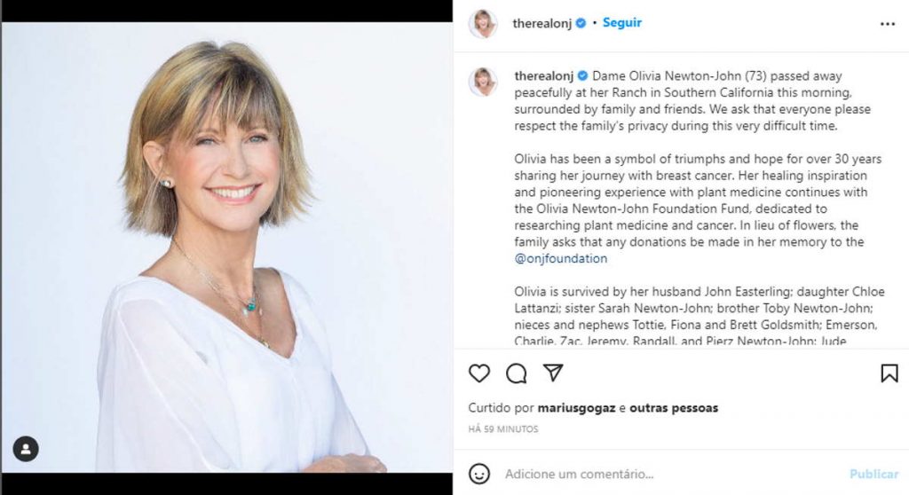 “A Dame Olivia Newton-John (73) faleceu pacificamente em seu rancho no sul da Califórnia esta manhã, cercada por familiares e amigos. Pedimos a todos que respeitem a privacidade da família durante este período muito difícil.