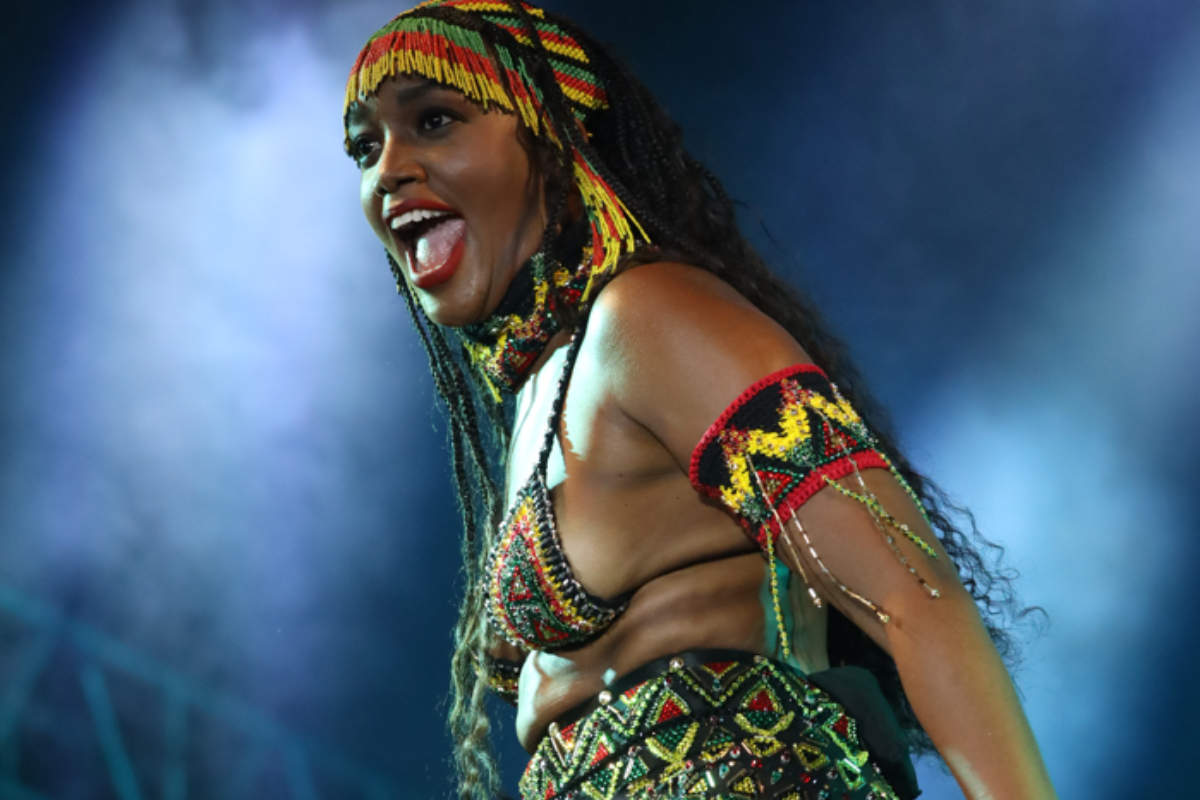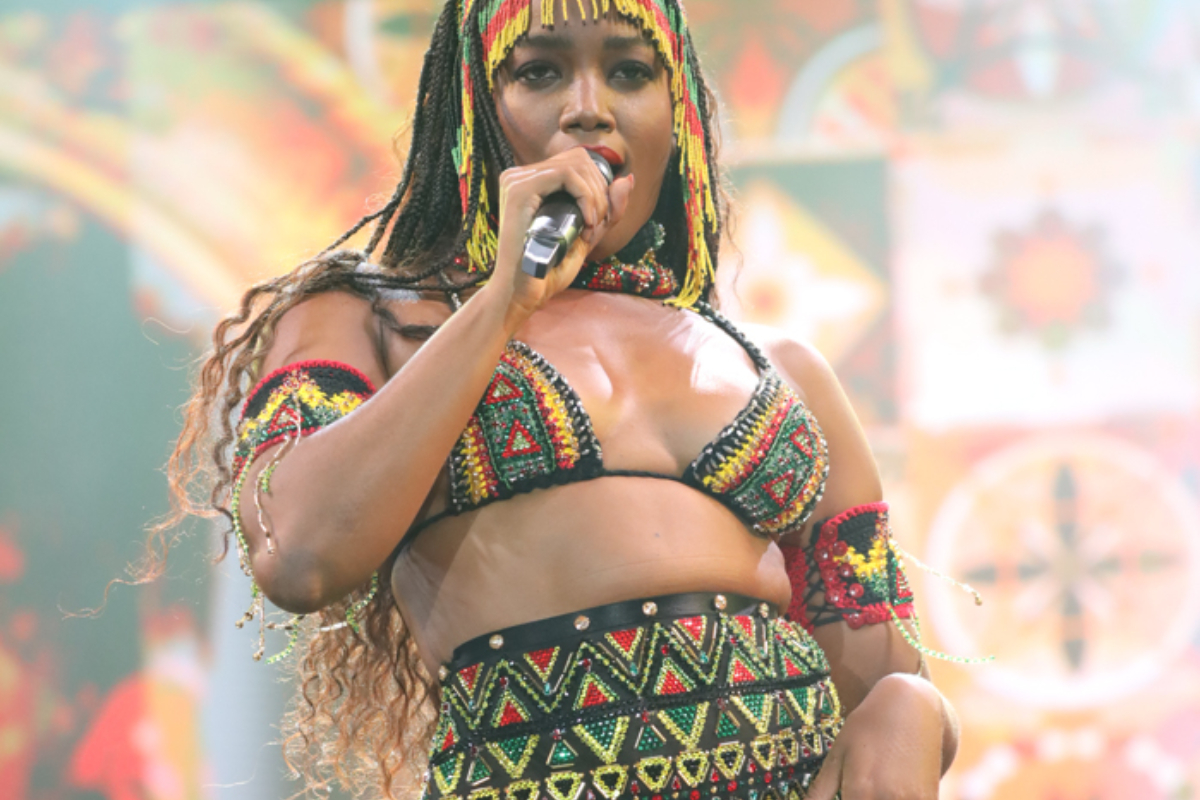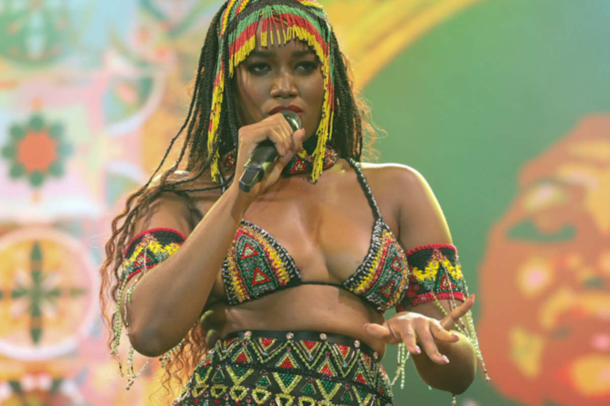 Para a apresentação, a cantora escolheu um look com referências inspiradas nas culturas africanas e jamaicanas, mostrado em primeira mão nas redes sociais a artista.