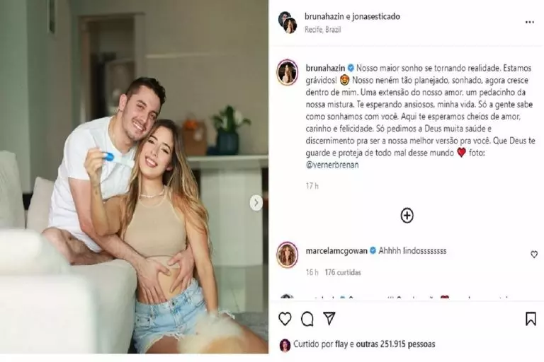 Nas imagens, o casal aparece sorridente e Bruna fez questão de mostrar o teste de gravidez com o resultado positivo. Além disso, a moça já ostenta uma barriguinha saliente.