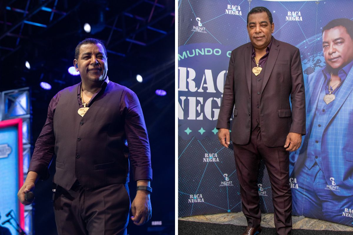 Vocalista do Raça Negra, Luiz Carlos, usa look preto para cantar em show (Beatriz Damy/Brazil News)