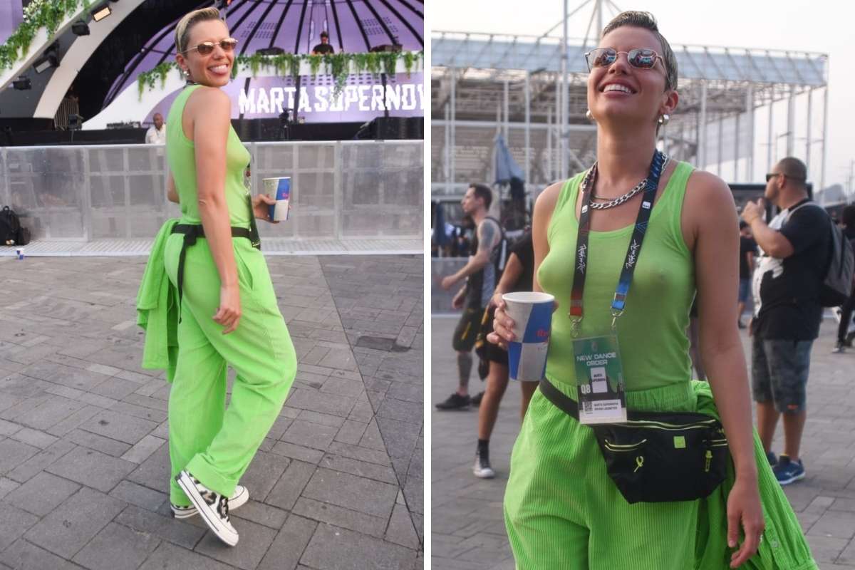 Seguindo a mesma ideia, Bruna Linzmeyer também ousou no visual. Ela apostou em um conjunto verde, mas deixou sutiã para trás. O tecido da camiseta era todo transparente, então, ela ostentou os seios praticamente à mostra. Nada incomum, mas criticável para algumas pessoas.