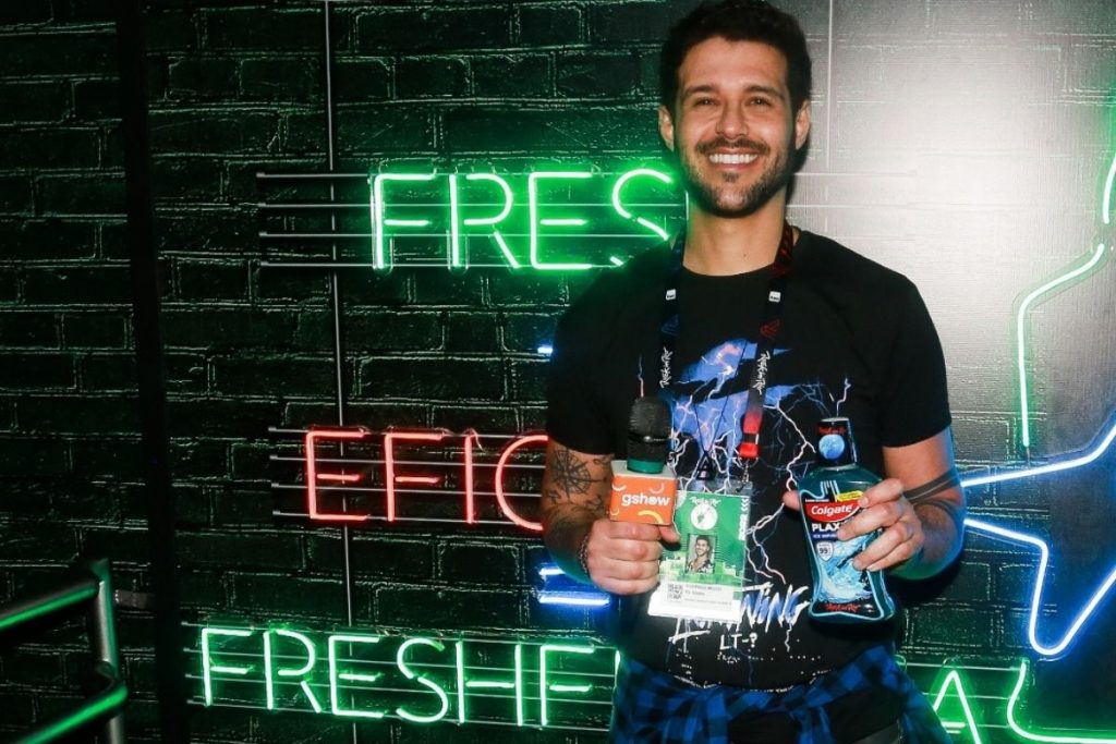 O influencer foi convidado pela marca Colgate para estar no espaço exclusivo feito para convidados, o chamado FreshStation, e posou simpático para os fotógrafos.