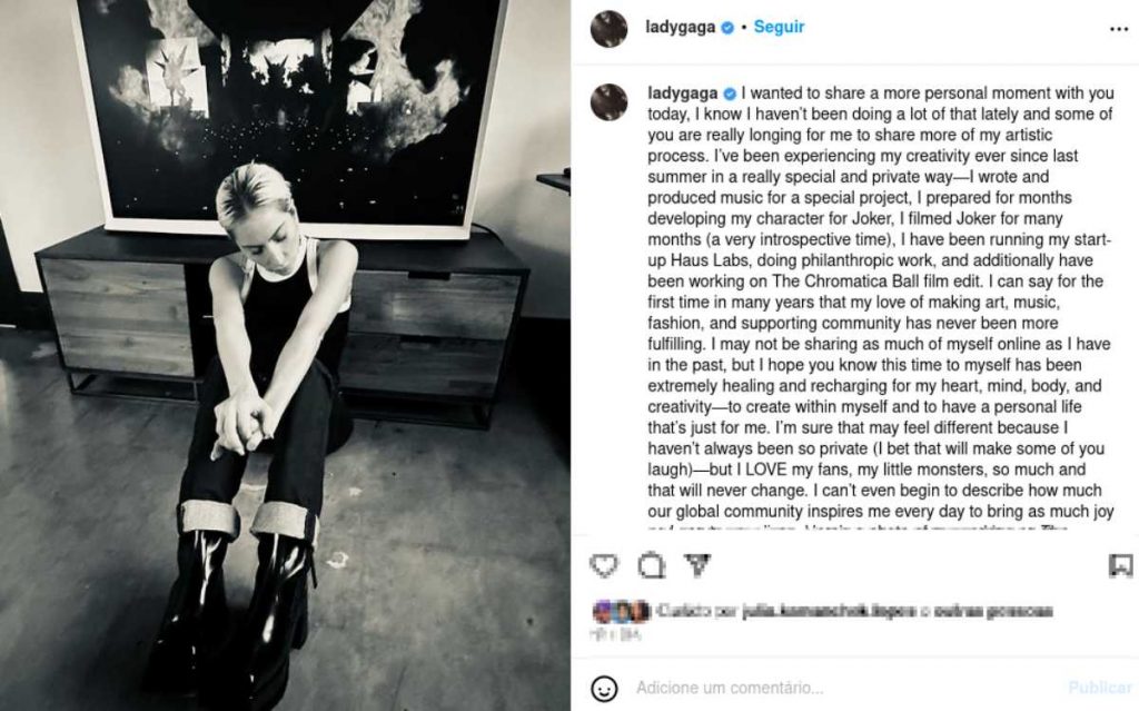 “Posso dizer pela primeira vez em muitos anos, que meu amor por fazer arte, música, moda e apoiar a comunidade nunca foi tão gratificante. Posso não estar compartilhando tanto de mim online quanto no passado, mas espero que você saiba que este tempo para mim foi extremamente curativo e recarregou meu coração, mente, corpo e criatividade – para criar dentro de mim e ter uma vida pessoal que é só para mim”, disse Gaga.