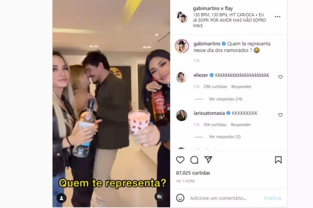 “Dia dos Namorados chegando. Quem te representa nesse Dia dos Namorados?”, perguntou Gabi aos seguidores, fazendo referência a estar solteiro ou estar com alguém, de forma bastante divertida.