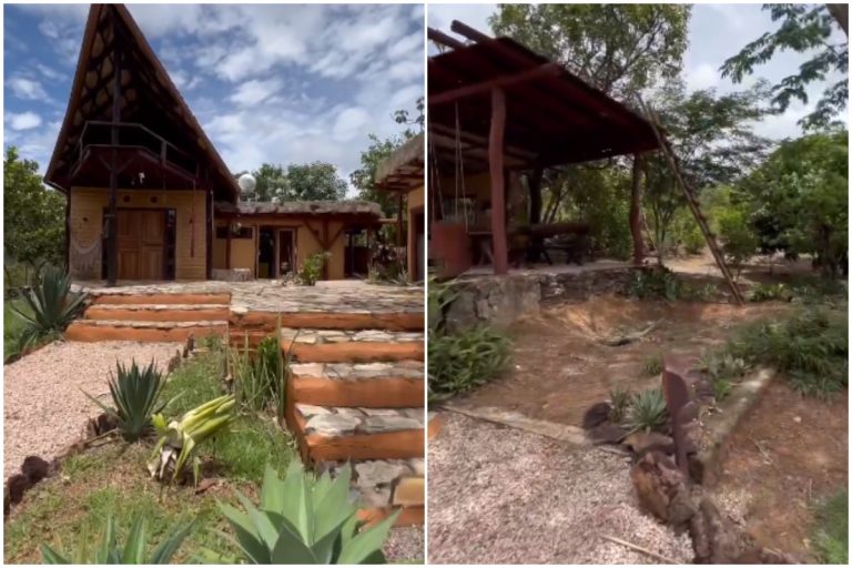 Com uma câmera em punho, Dado gravou a casa cercada de verde. “Uhul! Chegamos no paraíso. Olha isso, gente. Olha esse lugar”, babou o ator, filmando a moradia. “Um sonho essa casa. Que coisa mais deliciosa, no meio do mato. Olha que lindo, as bananeiras, as flores”, mostrou.