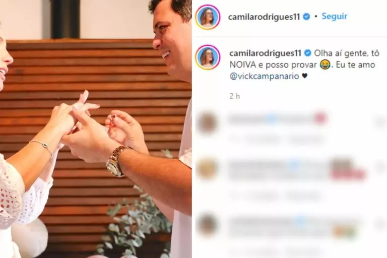A novidade foi revelada por meio de uma série de imagens do momento do pedido que foi publicada no perfil do Instagram da atriz. Nas fotos, é possível ver Vinicius ajoelhado enquanto entrega um anel para Camila e também há um registro dos dois se beijando.