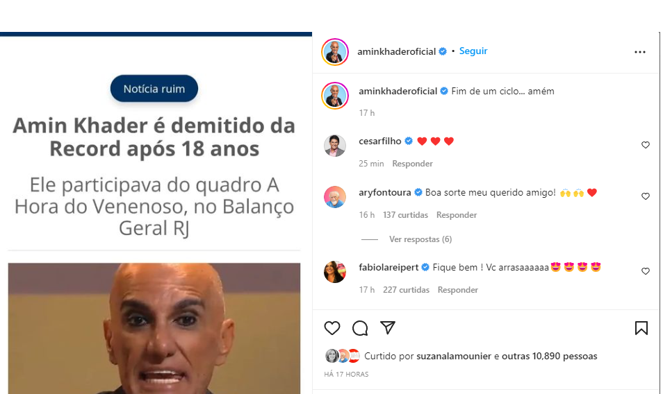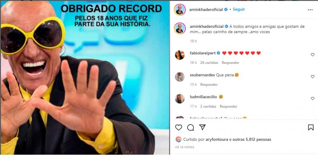 Nas redes sociais, Amin anunciou a sua saída: “Obrigada Record, pelos 18 anos em que fiz parte de sua história. A todos os amigos e amigas que gostam de mim, pelo carinho de sempre, amo vocês”. E em seguida, fez mais um post e disse: “Fim de um ciclo, amém”.
