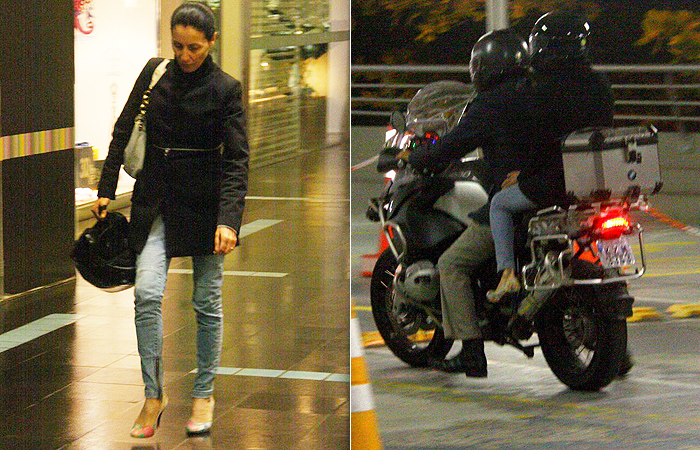 Cássia Kiss jantou com o marido, o psiquiatra João Baptista Magro, na noite de terça-feira (20), em um shopping do Rio de Janeiro. Após a refeição, a atriz, que vive Dulce em Morde & Assopra, da Globo, deixou o local na garupa da moto do marido.