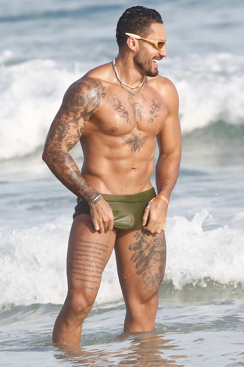 Entregando beleza, de sunga verde, com sua barriga negativa em destaque, o ex-participante de reality chamou atenção da mulherada e, ao perceber a presença do paparazzo, abri o sorrisão.