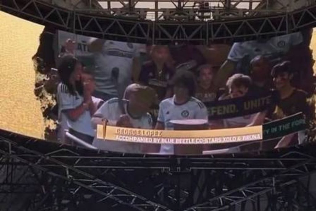 Bruna e outros membros do filme estavam tão animados no jogo que conseguiram um aparecer no telão do estádio, com direito ao nome da atriz na legenda da imagem.