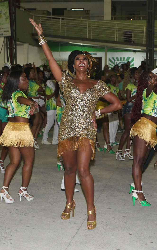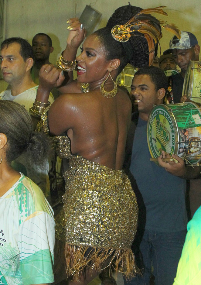 No ensaio, Cris escolheu um look para brilhar, literalmente. Ela estava com um vestido dourado curtinho e decotado nas costas na quadra da agremiação, em Ramos, na Zona Norte do Rio.