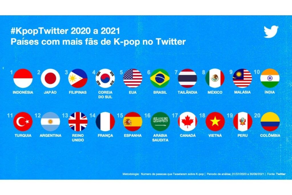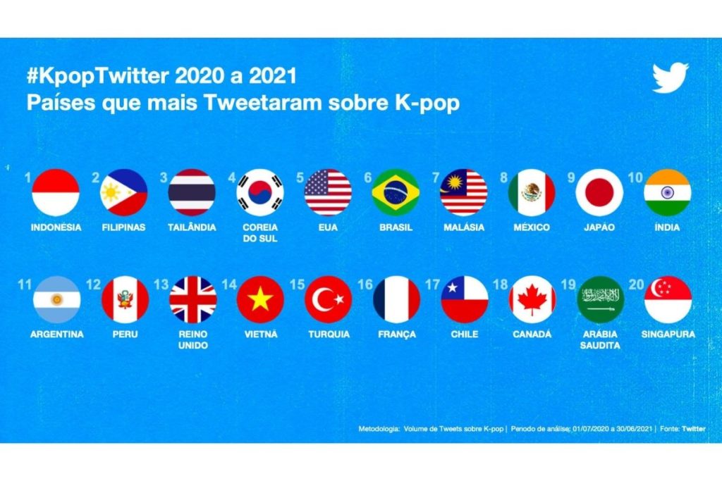 Segundo a plataforma, entre 1º de julho de 2020 e 30 de junho de 2021, foram contabilizados 7,5 bilhões de Tweets sobre K-pop no mundo todo. Dá para acreditar? A marca estabeleceu mais um recorde de maior número de postagens em um ano relacionados ao tema. Em comparação com o período anterior (entre 1/7/19 e 30/6/20), o crescimento foi de 20%.