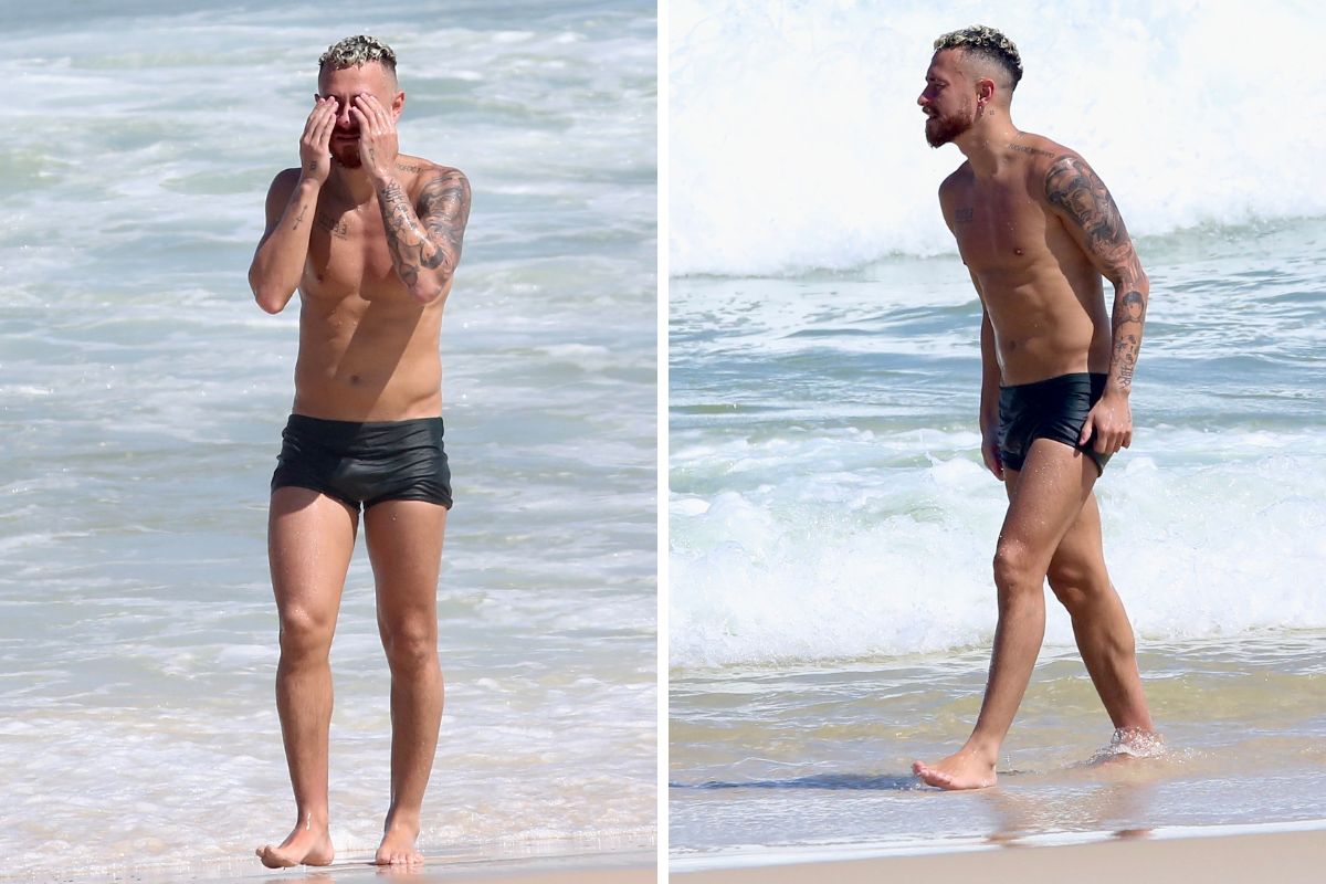 De sunga preta, com shape sarado e sozinho, além do sol, ele tomou um belo banho de mar para se refrescar.