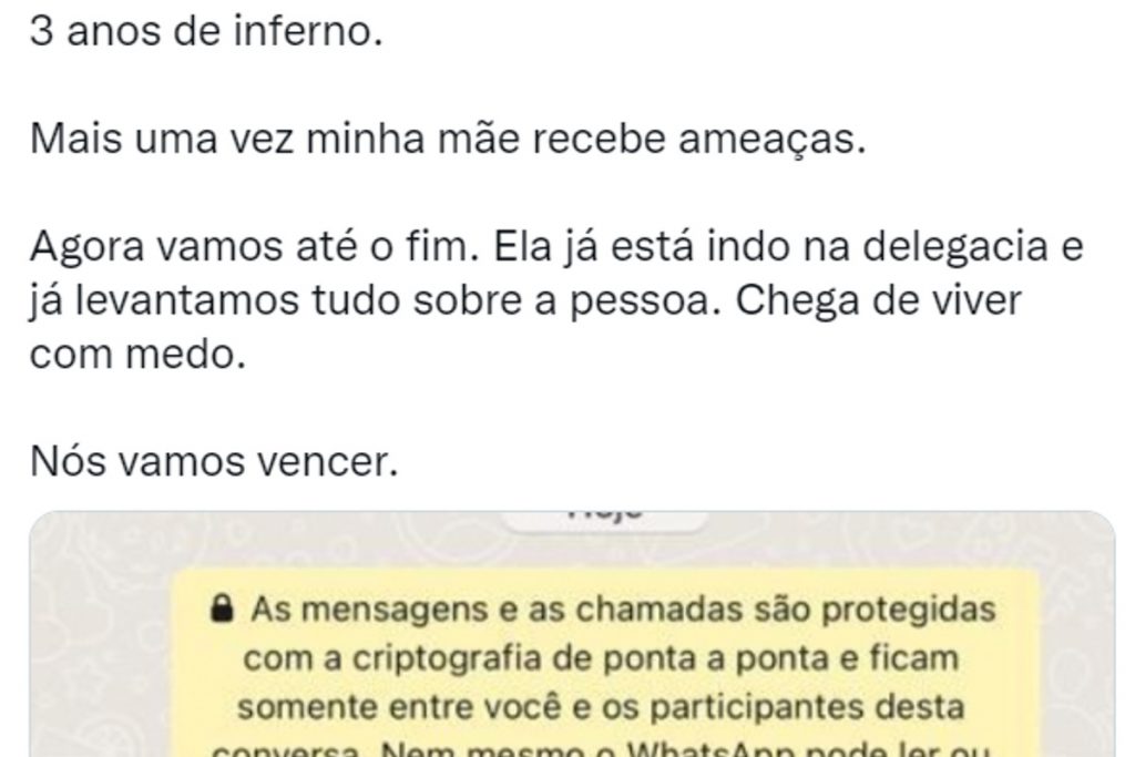 “Três anos de inferno. Mais uma vez minha mãe recebe ameaças. Agora vamos até o fim. Ela já está indo na delegacia e já levantamos tudo sobre a pessoa. Chega de viver com medo. Vamos vencer”, escreveu.