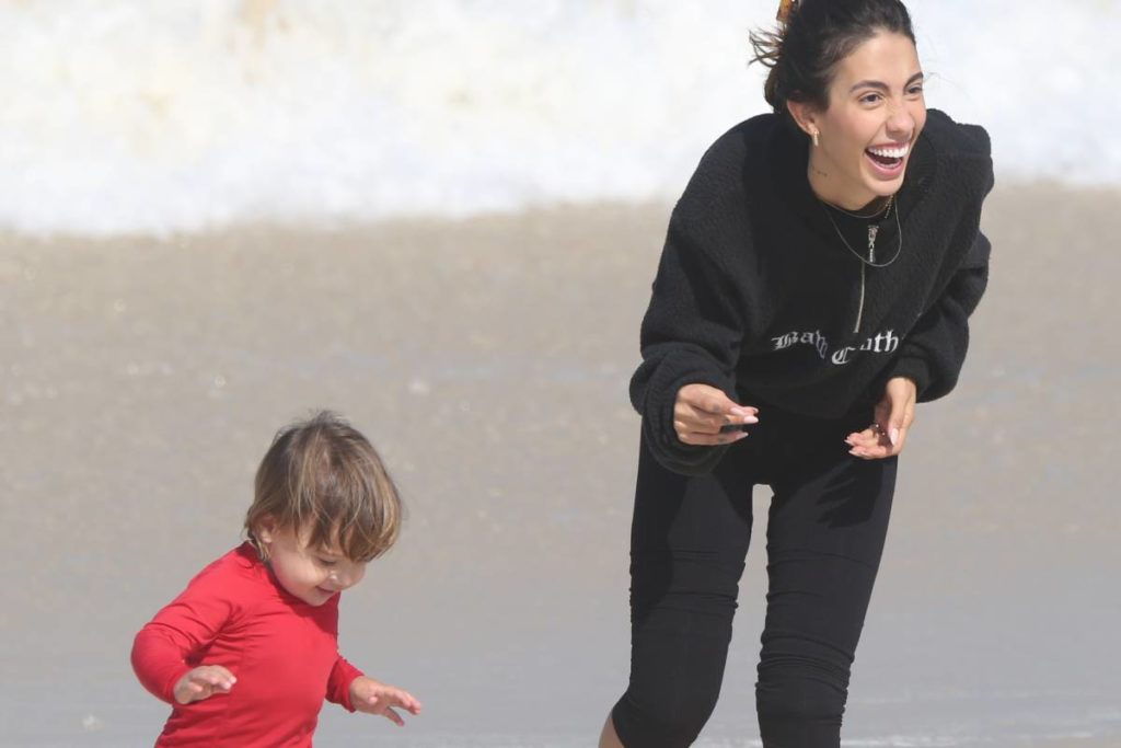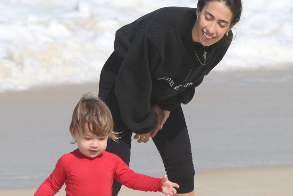 Gabi Brandt brinca com o filho e curte dia de praia na Barra da Tijuca