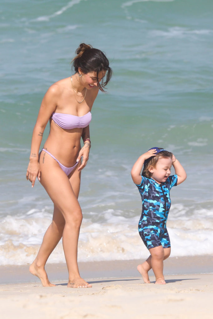 A influenciadora usava um conjunto de biquíni lilás, com a parte de cima sem alças e em uma amarração diferente. Já o pequeno Davi exibiu muita fofurice em uma roupinha para banho copm estampa camuflada em tons azuis. E não poderia faltar um pequeno boné.
