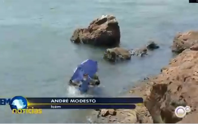 O jornalista seguiu firme, destacando os prejuízos que a baia do rio causava para os moradores. Ao final, disse que não havia se machucado. “A gente sabe que está calor, eu só estava refrescando aqui os meus pés”, descontraiu.