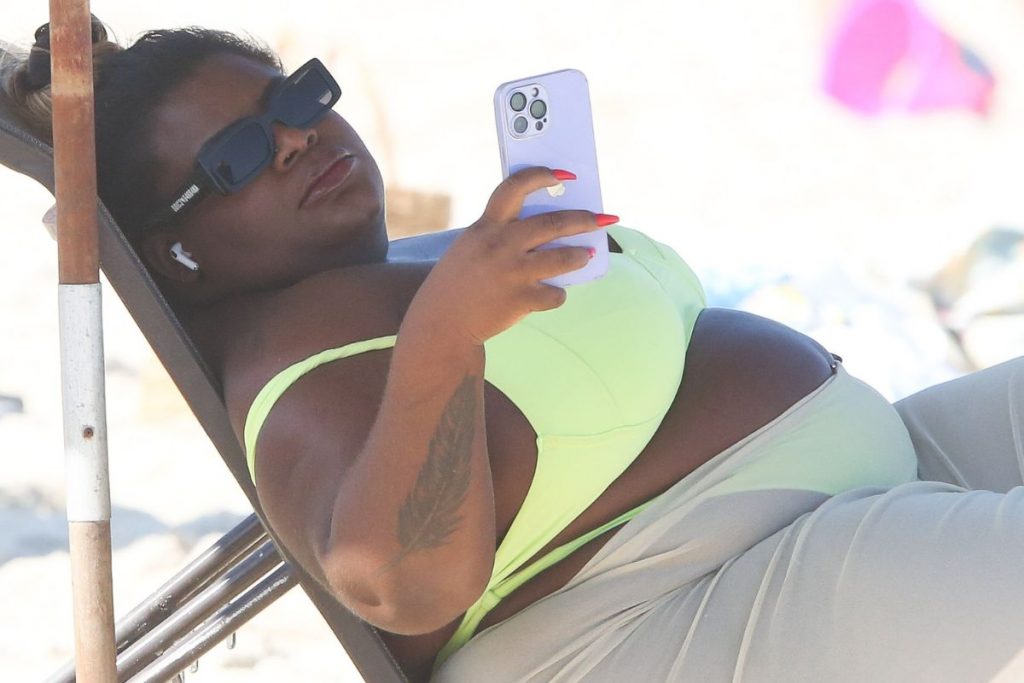 A cantora estava com seu biquíni neon e celular na mão e usou ainda uma calça saída de praia transparente, ficando a maior parte do tempo se protegendo do Sol e checando as mensagens no telefone. Além disso, atendeu ao pedido de um fã para fazer uma selfie com ele.