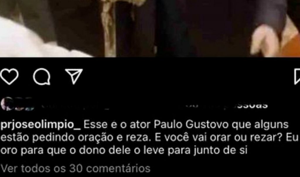A postagem foi feita na conta pessoal do pastor José Olímpio no Instagram e apagada depois da repercussão negativa. Acompanhado de uma foto do ator, o texto dizia: “Esse é o ator Paulo Gustavo que alguns estão pedindo oração e reza? E você vai orar ou rezar? Eu oro para que o dono dele o leve para junto de si”.