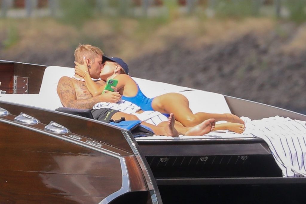 Justin Bieber e Hailey Bieber trocam beijo durante passeio de barco. Veja!