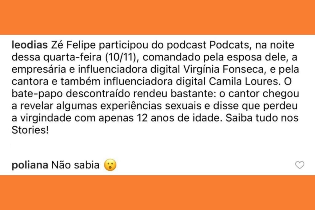 Depois de Zé Felipe revelar que perdeu a virgindade aos 12 anos, Poliana Rocha, mãe do cantor, ficou surpresa com a revelação do herdeiro. Por meio de um post feito por Leo Dias, sobre o assunto, a loira afirmou, nos comentários: “Não sabia.”