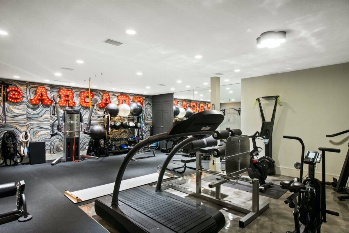 A planta baixa de três andares deixa muito espaço para amenidades, incluindo uma sala de jogos, bar, escritório, academia, sala de mídia. No andar de cima, a suíte principal adiciona extras, como sala de massagem e terraço privativo. É um de sete quartos e 10 banheiros.