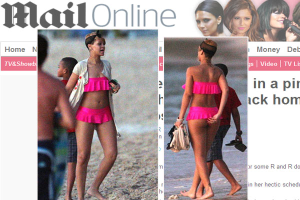 Rihanna curte a praia com biquíni pink de babadinho, em Barbados.