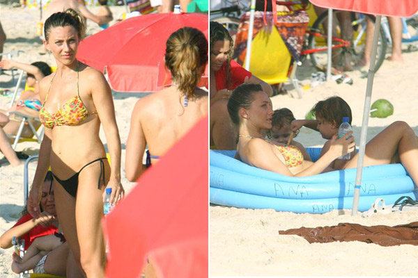 Vanessa Bueno entra em piscininha com filho, na praia