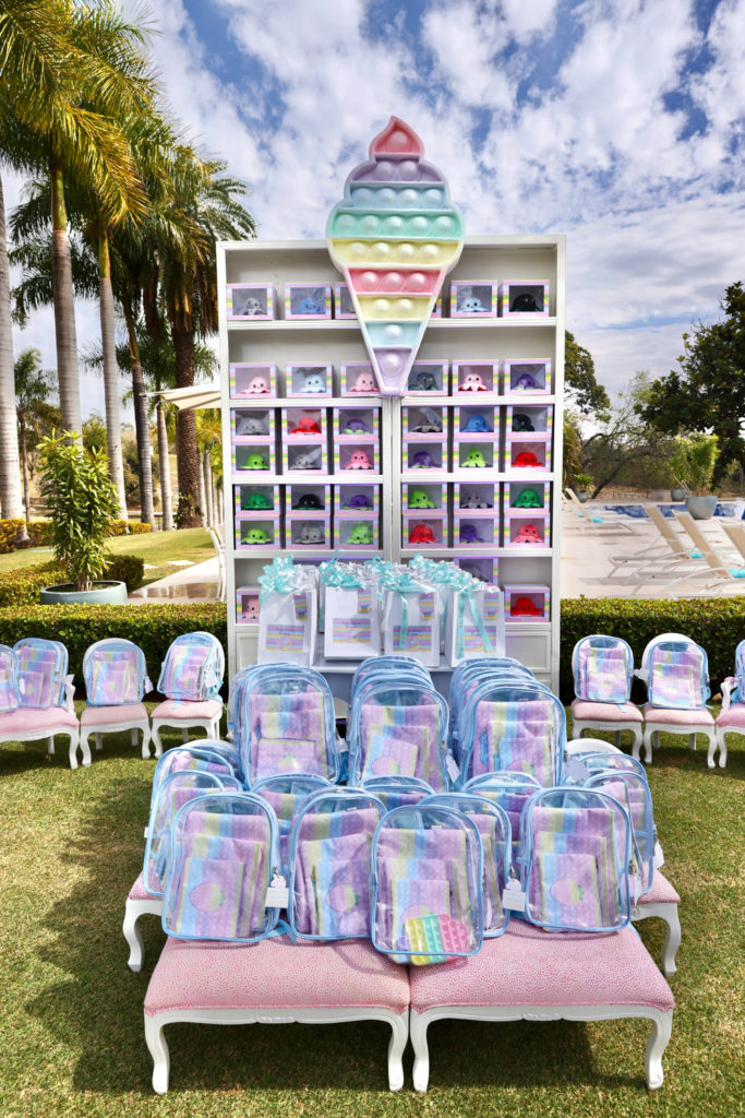 A festa contou com a decoração e cuidado de Andréa Guimarães e teve como tema o Fidget Toys, em tons pastéis e muitas flores.