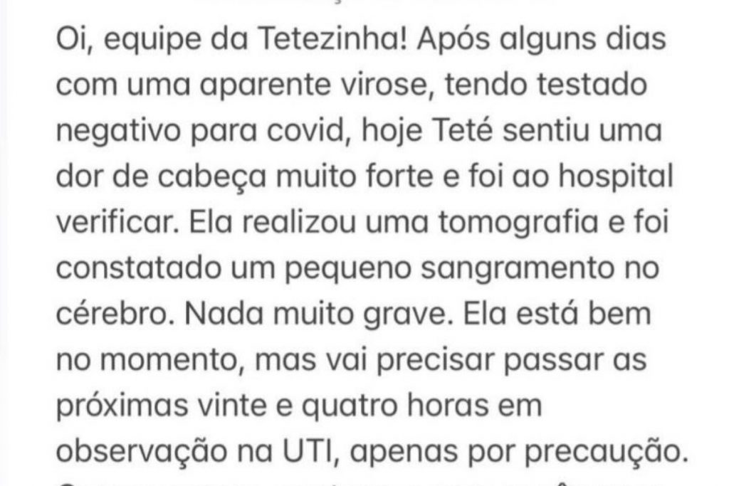 “Após alguns dias com uma aparente virose, tendo testado negativo para Covid-19, hoje, Teté sentiu uma dor de cabeça muito forte e foi ao hospital verificar”, destacou o comunicado, inicialmente.
