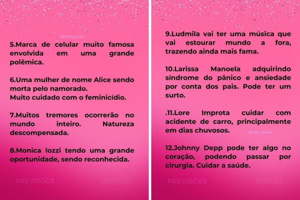 De acordo com a publicação de Grazik, Larissa Manoela pode ter uma grande crise de síndrome do pânico; Lore Improta deve tomar cuidado ao dirigir em dias chuvosos e Johnny Depp pode passar por uma cirurgia no coração: