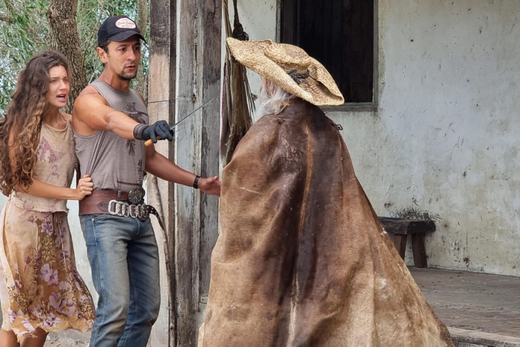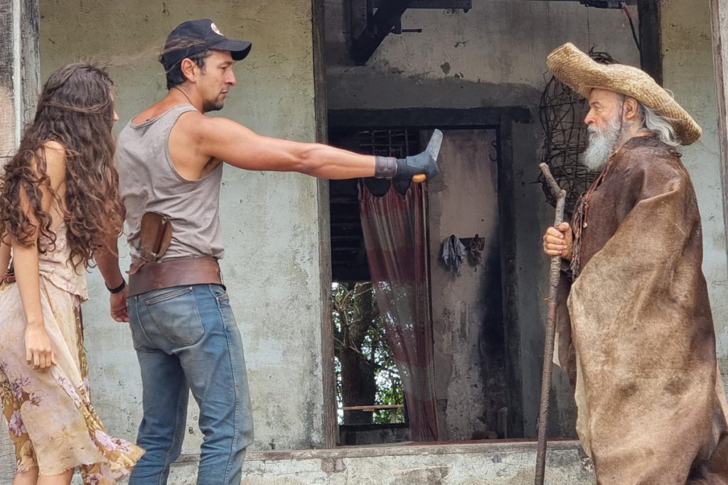 Ali já fica claro para o público que o animal que chega é Maria Marruá (Juliana Paes) presente para defender a filha. Com sangue nos olhos e com a faca na mão, o peão, obstinado, tenta conter seu pavor. É quando o Velho do Rio (Osmar Prado) chega para salvar todos dessa situação, principalmente o neto, que está a um passo da morte. Com sangue nos olhos e com a faca na mão, o peão, obstinado, tenta conter seu pavor. É quando o Velho do Rio chega para salvar todos dessa situação, principalmente o neto, que está a um passo da morte.
