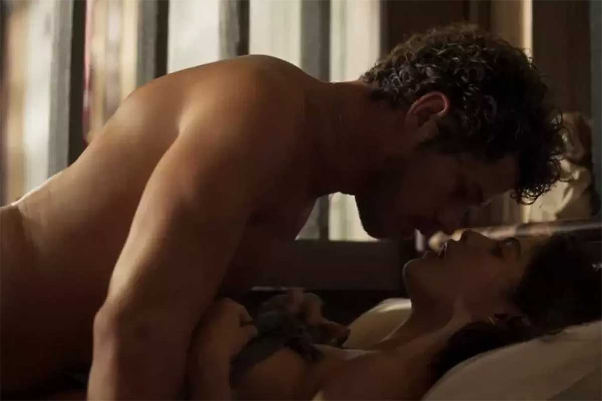 Tadeu (José Loreto) e Zefa (Paula Barbosa) na cama, para a primeira transa em Pantanal – Foto: Reprodução TV Globo