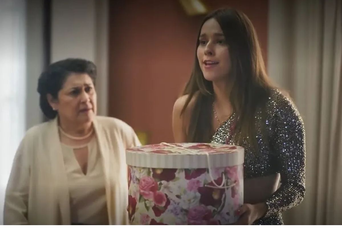 Berenice (Thati Lopes) chega com a caixa contendo uma cobra – Foto: Reprodução TV Globo