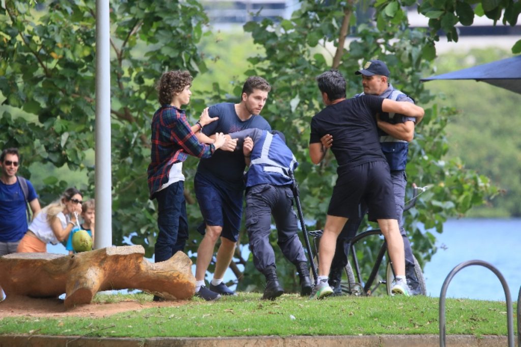 Um paparazzo que estava a espreita, clicou o momento do confronto de Moretti e Caíque. Foi soco de um lado, tapa do outro, até o aparecimento de dois guardas municipais que chegaram para separar a briga. Repare que há um profissional da direção da novela vestido de roupa escura que orienta dos atores nas ações.
