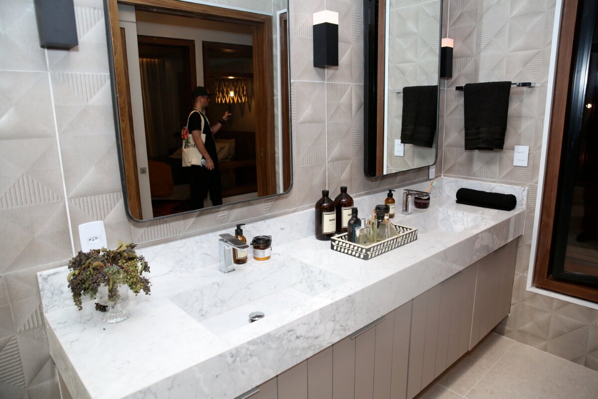 Outro cenário curioso é a luxuosa casa do empresário e o quarto de sua filha, Chiara, interpretada por Jade Picon, presente em nossa visita. O cômodo da jovem é contemporâneo, conta com fotos da personagem espalhadas por todos os cantos, um closet de tirar o fôlego e um banheiro enorme.
