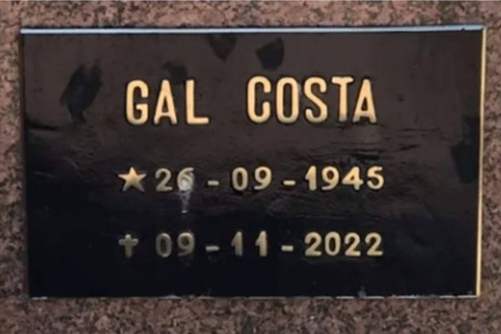 Sem registro desde novembro de 2022, o túmulo de Gal Costa, enfim, ganhou uma placa de identificação com o nome da cantora. O corpo da artista está enterrado no mausoléu que pertence à família de Wilma Petrillo, sua companheira do fim da vida, no Cemitério Venerável Ordem Terceira Nossa Senhora do Carmo, na região da Consolação, em São Paulo.
