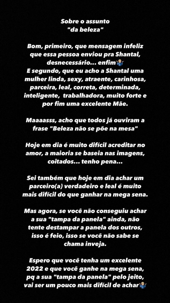 “Sobre o assunto ‘da beleza’. Bom, primeiro, que mensagem infeliz que essa pessoa enviou para a Shantal, desnecessário, enfim. E segundo, que eu acho a Shantal uma mulher linda, sexy, atraente, carinhosa, parceira, leal, correta, determinada, inteligente, trabalhadora, muito forte e, por fim, uma excelente mãe. Mas acho que todos já ouviram a frase ‘beleza não se põe na mesa'”, disse o modelo.