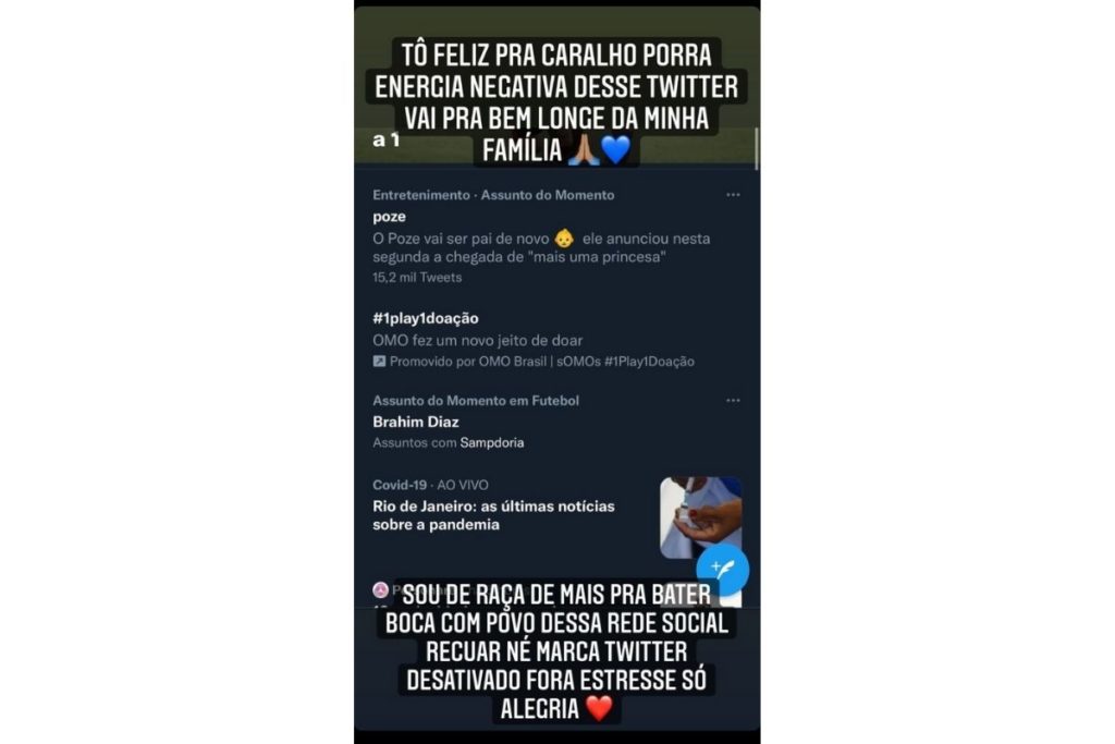 “Tô feliz para c*ralho p*rra. Energia negativa desse Twitter vai para bem longe da minha família”, disparou ele. “Sou de raça demais pra bater boca com o povo dessa rede social. Recuar né marca. Twitter desativado. Fora estresse, só alegria”, completou o funkeiro nos Stories do Instagram.
